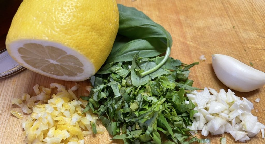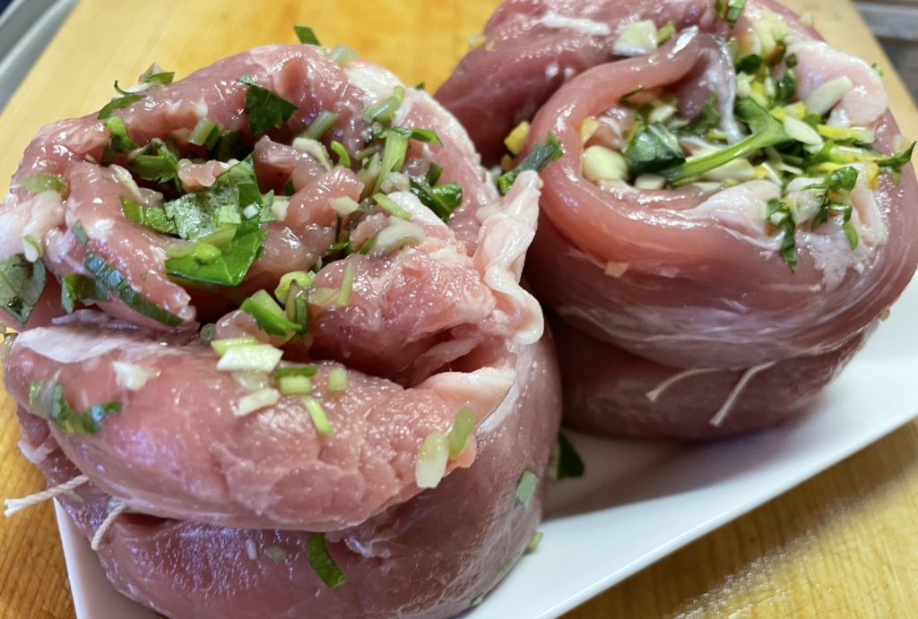 スイートバジル、レモンピール、にんにくをみじん切りして少量のオリーブオイルで和えたものをヒレ肉で巻いていく