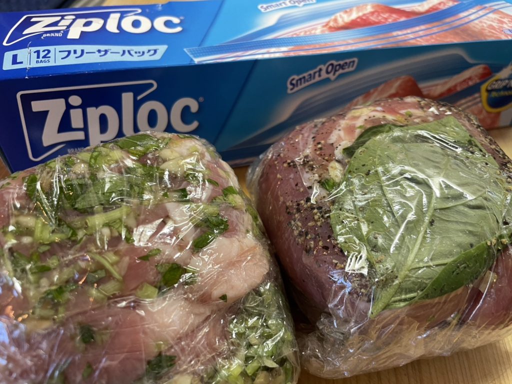 洋風の方には少し周りにブラックペッパーをまとわせ、ラップでくるんだらジップロックに入れ、空気を抜く。