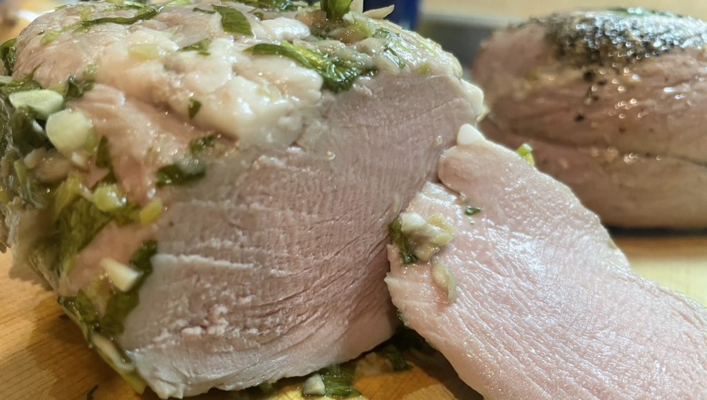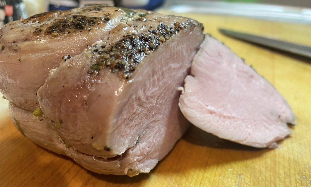 ポルケッタ風、とかいったがポルケッタは脂身のある部位でやるのが正しいらしいし、低温調理じゃなくオーブンでのローストなので全く別物ではある。それでも美味しいからいいか~!となった。